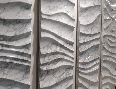 A 3D wave pattern intricately carved into 40mm thick statuario white marble and elegantly finished in a glossy mirror polish.